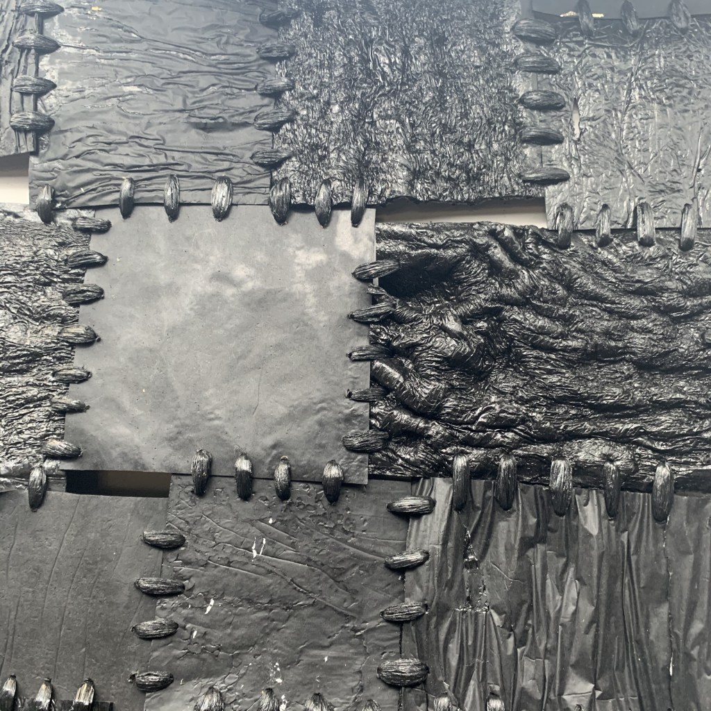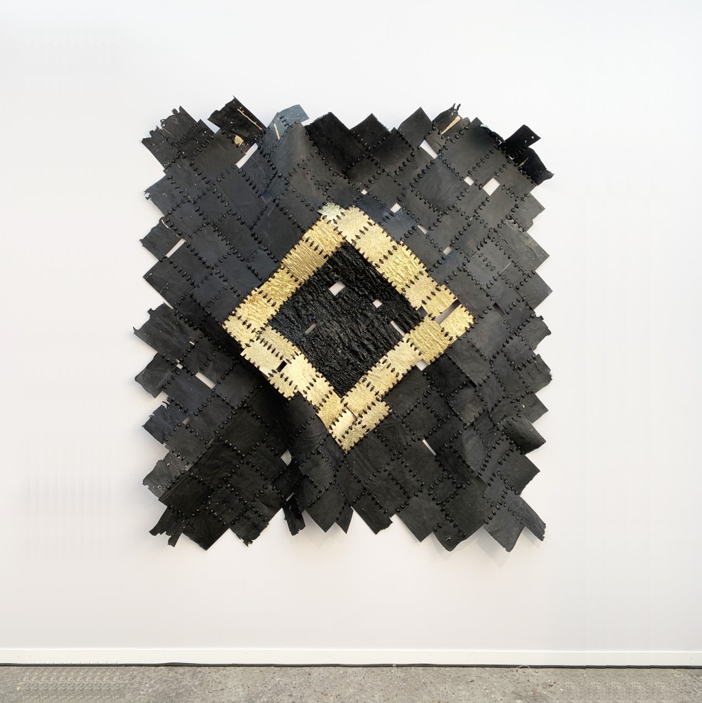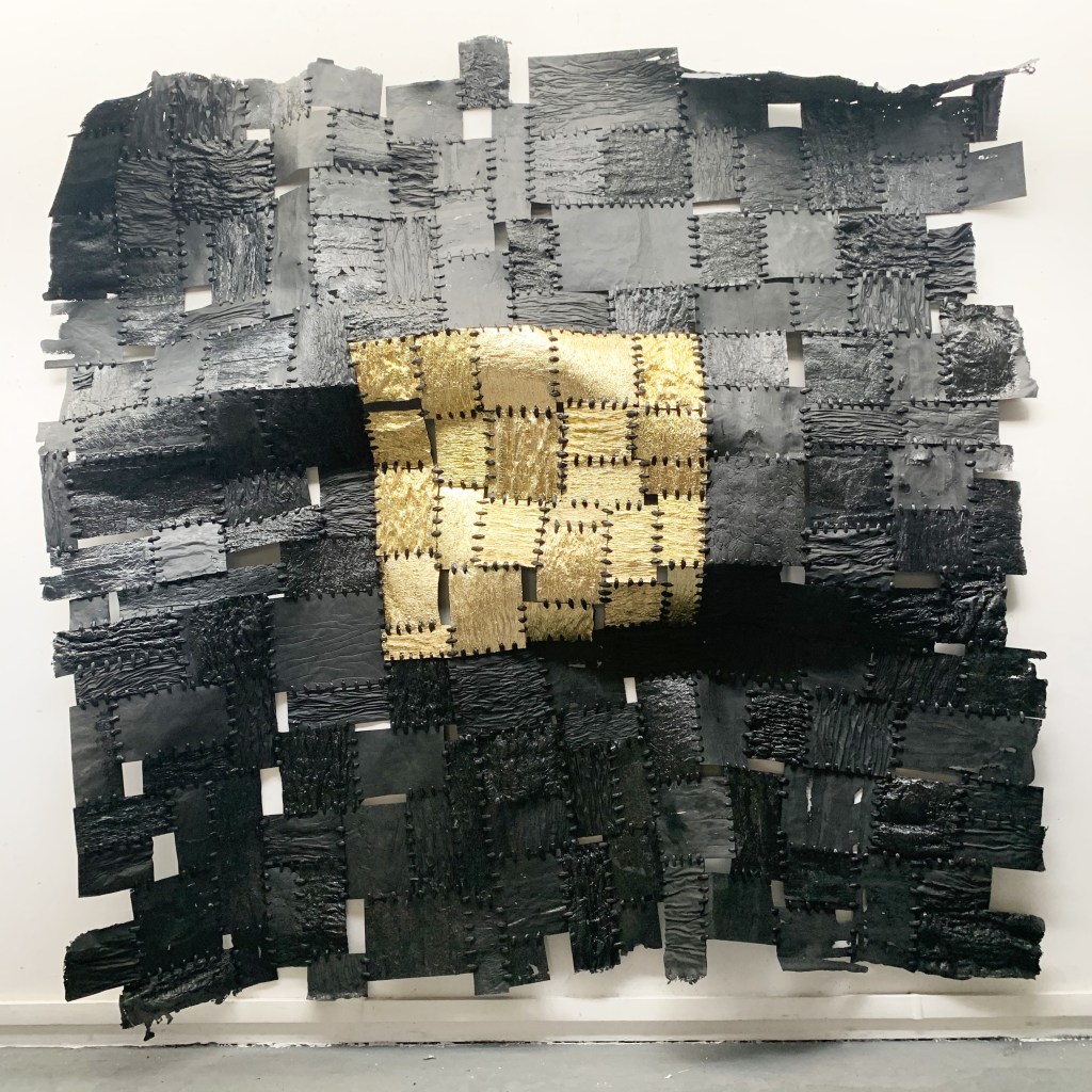 Carré de survie II, 150 x 150 x 5 cm, thermoformage et soudure plastique, plastique (film noir et couverture de survie), 2019