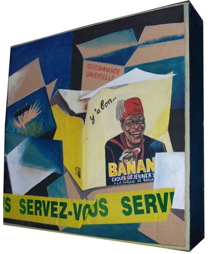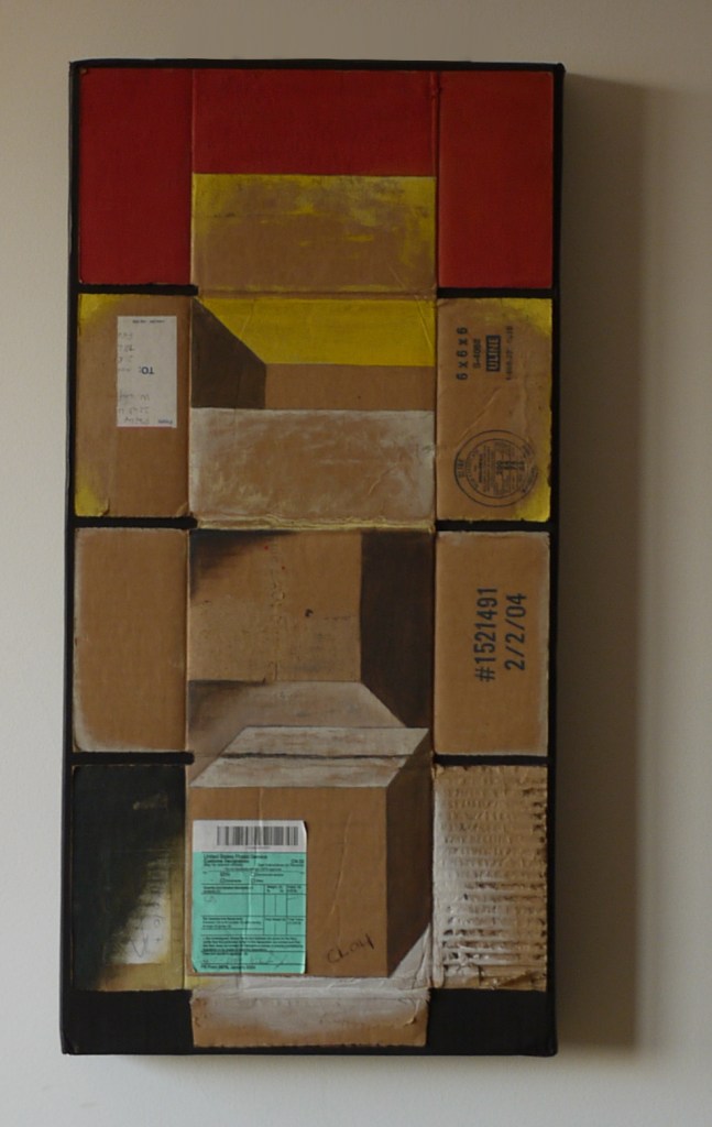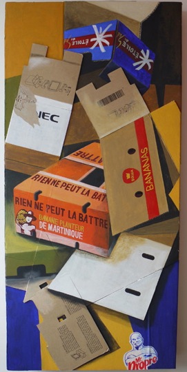 Ici dans ce travail, l’emballage de carton reste emballage de lui-même peint en transparence sur carton, sans contrefaçon, quelque chose à l’inverse du trompe l’œil en peinture. Là, il n’est pas question d’objet, de portrait de nature. Interprétés sur la toile, les peintures de ces cartons sont véritablement du « carton ».