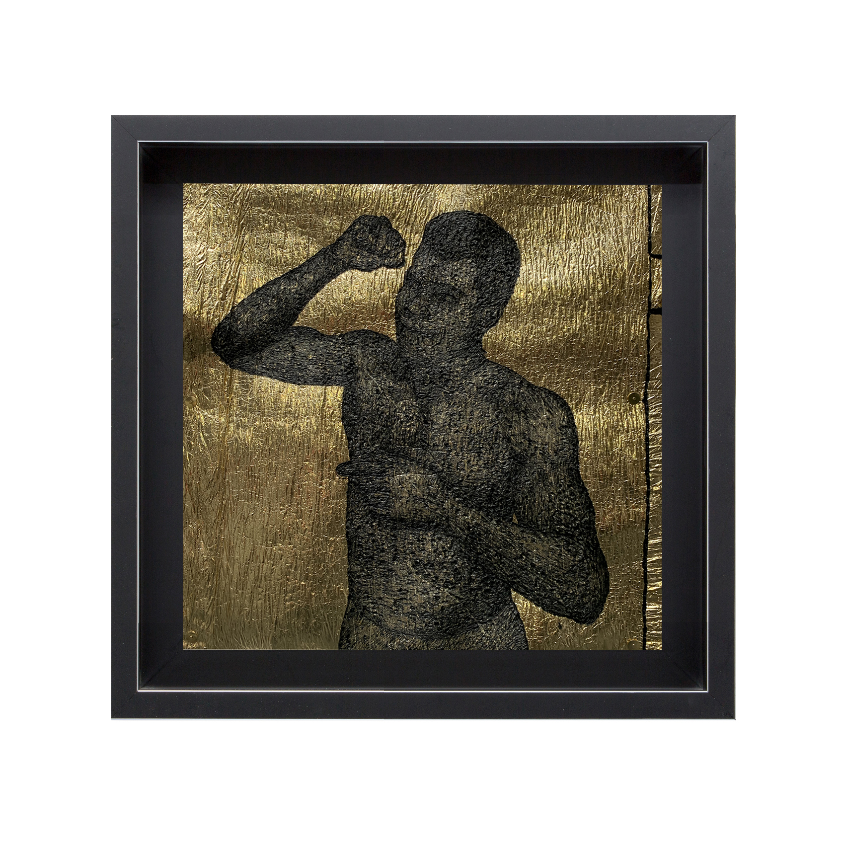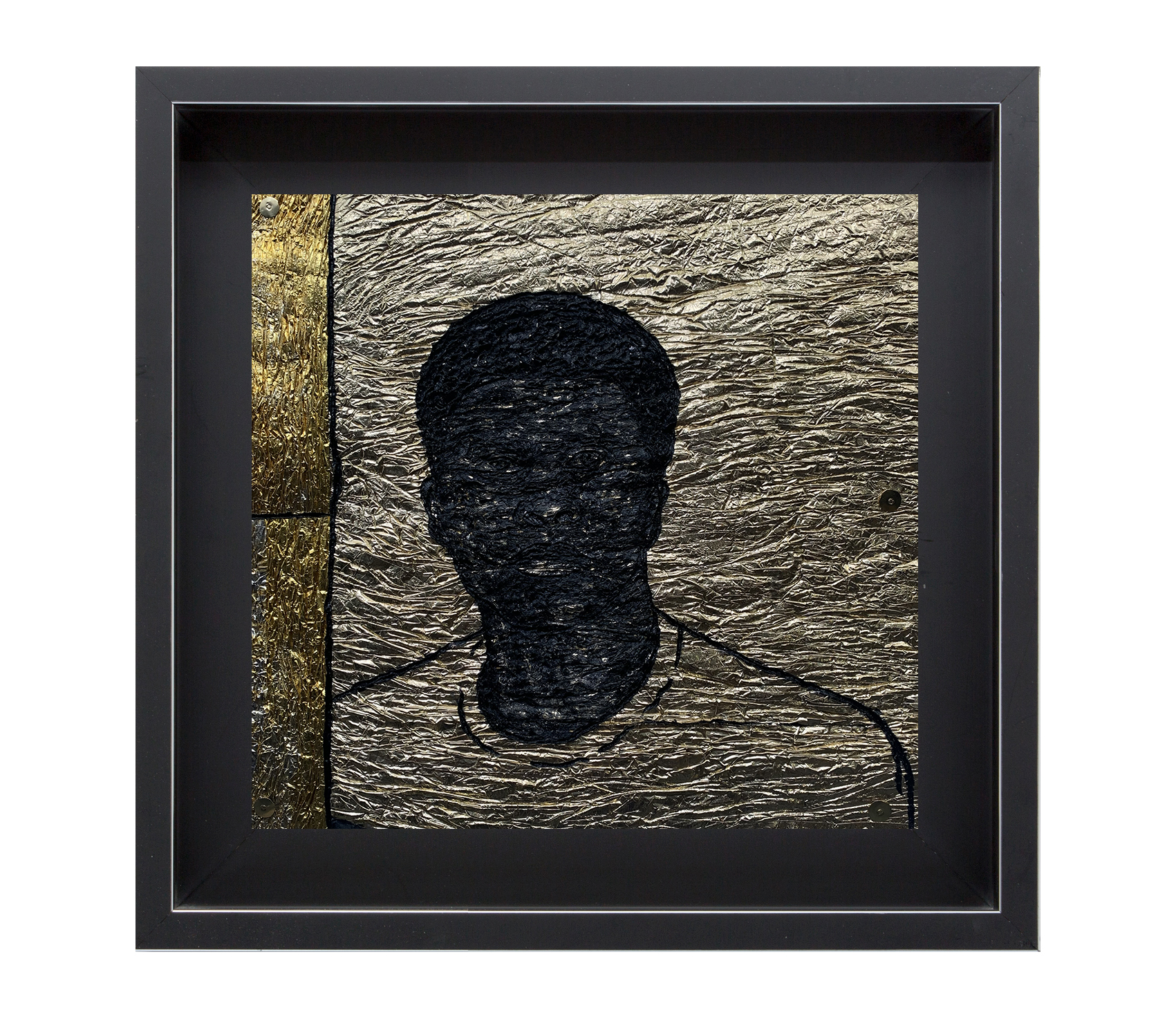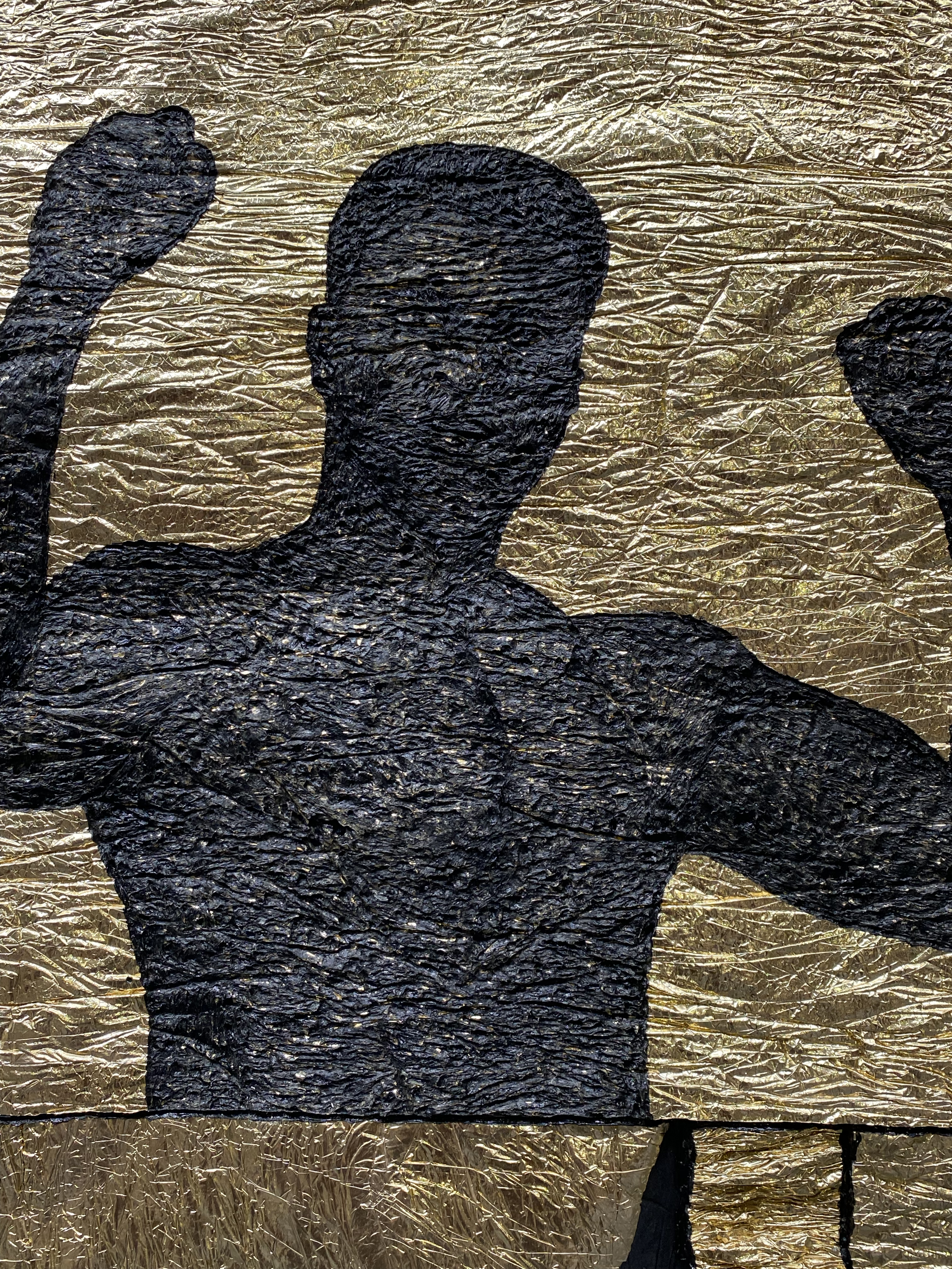 En associant le film plastique noir à la couverture de survie, l’artiste explore les propriétés du plastique. Il travaille la matière brute par compression puis combustion pour créer un support à la texture singulière sur lequel des figures seront gravées. Les modèles représentés sont des proches ou des personnalités dont la détermination et le courage ont inspiré l’artiste. Il dédie une série de portraits à Mohamed Ali, icône d’un combat pour la liberté et contre l’injustice.